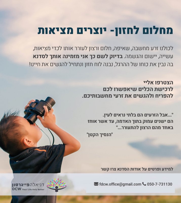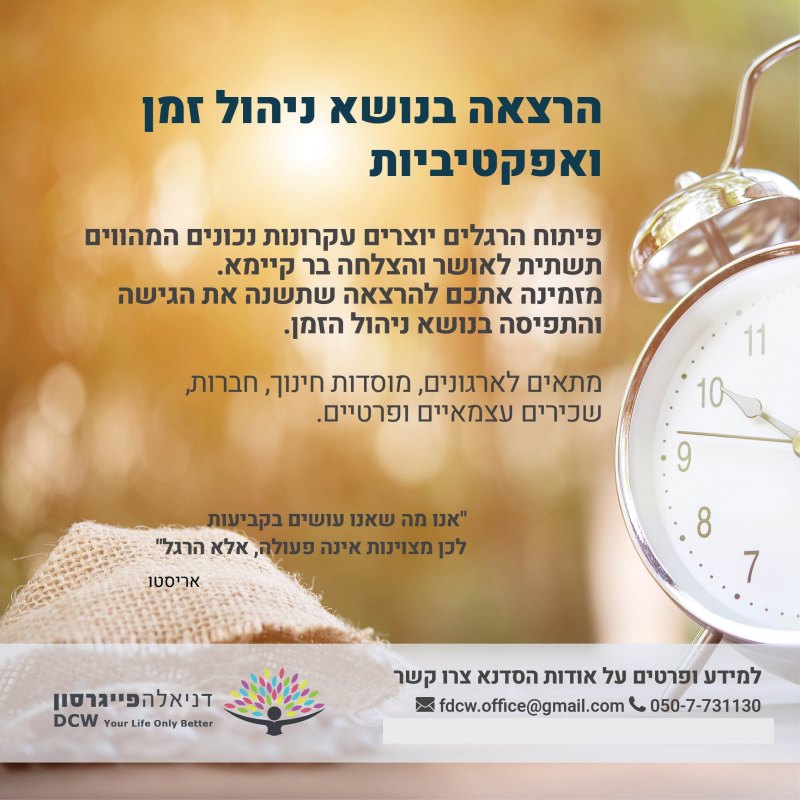 DCW הינה חברה העוסקת בתחום הפיתוח האישי ומעניקה שירותי ייעוץ, הדרכה, אימונים אישיים וקבוצתיים, הרצאות והדרכות לתהליכים השמים פוקוס על התתפתחות האישית במישורים מקצועיים ועסקיים תוך שימת דגש על LCB (Life Career Balance).