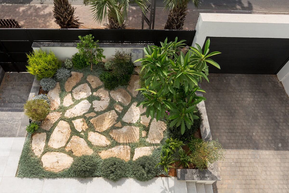 עיצוב באבן מדרך בזלת וכורכר בשילוב צמחייה. חזרה >>